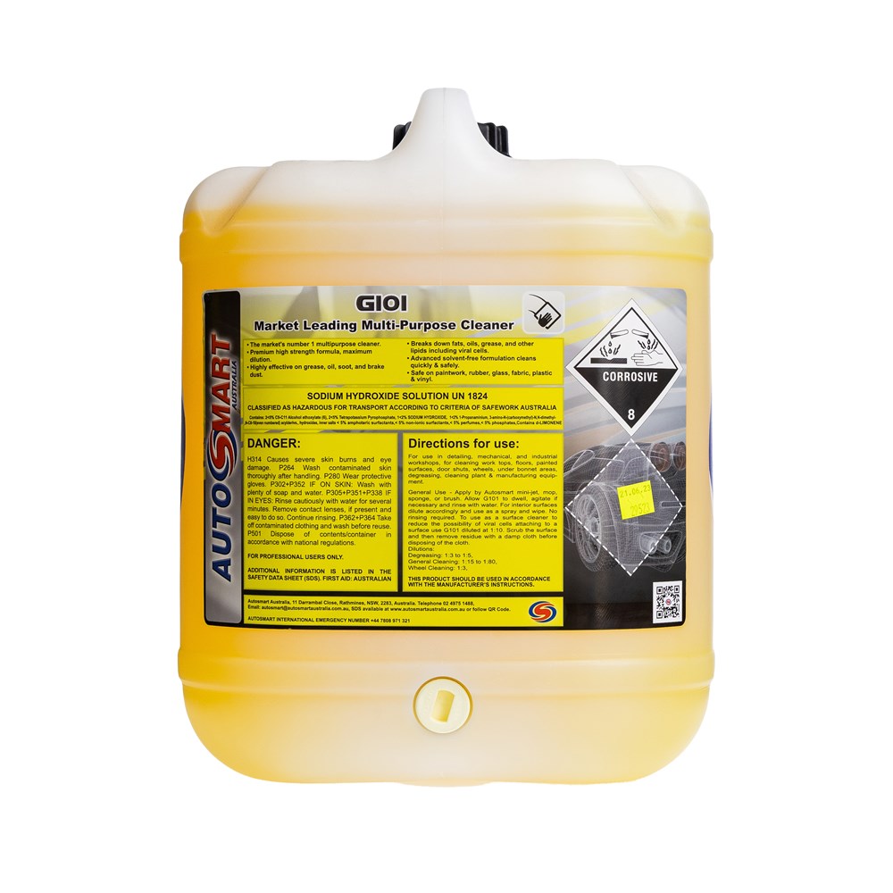 Our G101 multi-purpose cleaner is our top-rated, versatile solution, ideal for hard surfaces, painted areas, wheels, and more. Its advanced solvent-free formulation effectively tackles grease, oil, soot, and brake dust while being safe on paint, rubber, glass, fabric, plastic, and vinyl.