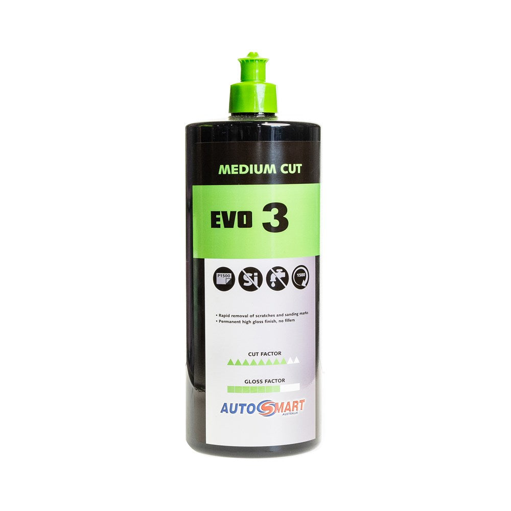 Evo 3 is a medium to hard grade cutting compound, perfect for paint correction tasks such as flattening marks, removing scratches, deep marring, and water/acid etching. It's ideal for use after de-nibbing and ensures a high-gloss finish with easy cleanup. Designed with reduced lubricants for more aggressive cutting, it can also be used with water to extend working time.