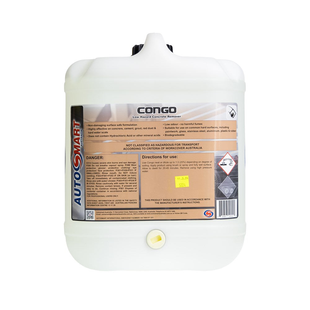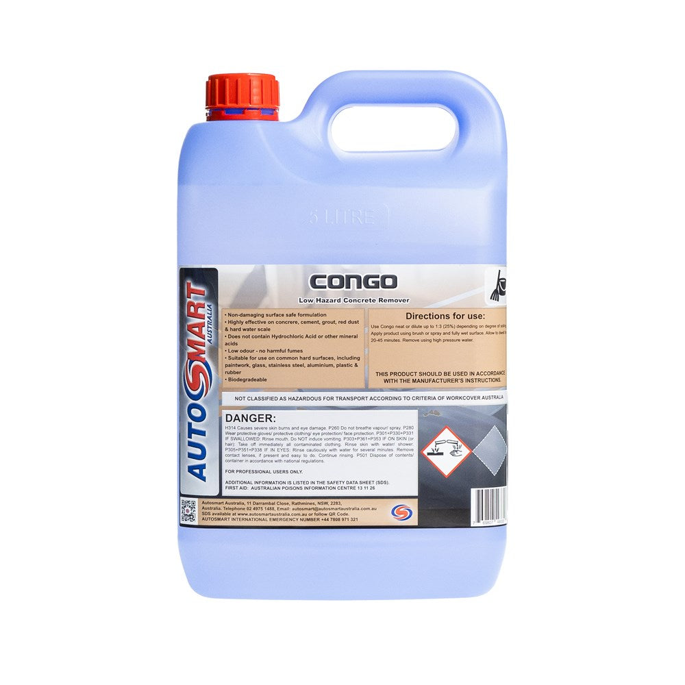 Instructions: Congo has been developed to remove concrete and other calcium-based soils without the corrosion issues associated with conventional products. Use product neat or dilute up to 1:3 (25%) depending on degree of soiling. Apply product using brush or spray and fully wet surface. Leave to dwell ideally overnight. Remove using high pressure water. Does not contain Hydrochloric Acid or other mineral acids.