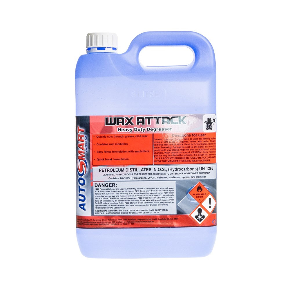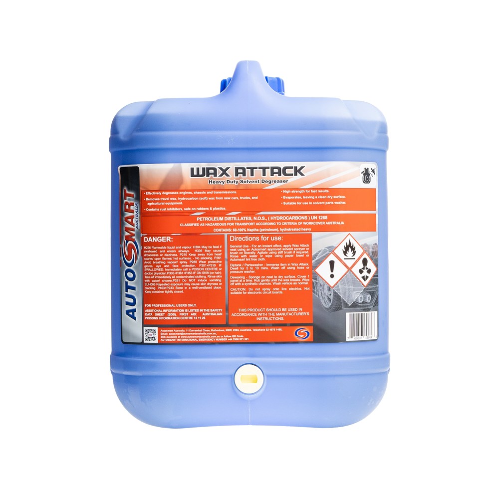 Instructions: Use neat. Spray, brush or wipe on. Agitate using a stiff brush if required. Rinse with water. Dip tank: Immerse item in Wax Attack. Dwell for 5-10 minutes. Rinse with water. Dewaxing: Sponge on neat to one panel at a time. Rub gently until wax breaks. Wipe off with an AutoSmart synthetic chamois. Wash vehicle as normal.